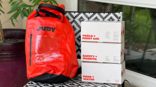 A bright orange backpack full of emergency evacuation essentials.