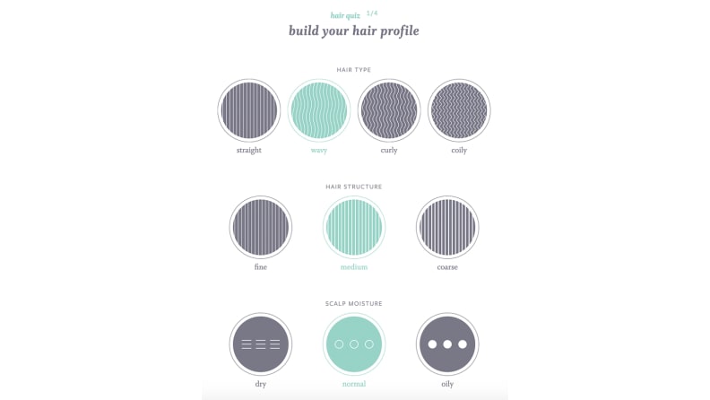 The first step is to answer some questions about your hair type, which are illustrated by graphics, though they're more cutesy than helpful. I’ve described my hair (see above) as curly since middle school, but after a small existential crisis followed by a Google search to determine the difference between curly and wavy, I selected “wavy” for my hair profile (other options include straight, curly, and coily). The majority of my hair is more wavy than curly because it’s slightly weighed down by the length and has felt the heat of a hair dryer or [straightener](https://www.reviewed.com/home-outdoors/best-right-now/the-best-hair-straighteners_ too many times. I chose “medium” as my hair structure out of fine, medium, and coarse—my strands are not wispy, nor are they wiry. For scalp moisture, I selected normal out of dry, normal, and oily; I can go a few days before my hair gets oily, and I don’t have a dry scalp even in the winter months when my skin suffers.