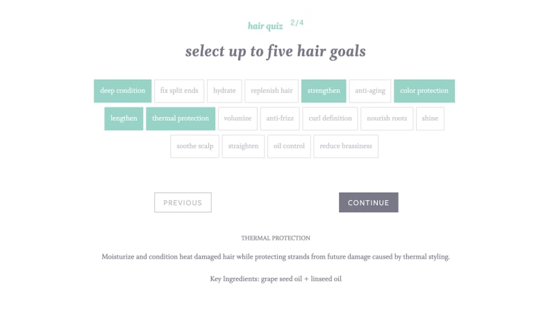 Step 2: Your hair goals My favorite part of the hair quiz was selecting my goals—up to five—for how I want my hair to look and feel from the 18 options. As you click each option, Function of Beauty’s definition of the goal pops up, as well as the key ingredients the company uses to achieve each goal. For example, I chose to strengthen my hair, and an explanation popped up saying: “Increase your hair’s resilience and elasticity, stimulate healthy hair growth and protect your hair from breakage. Key ingredients: horsetail extract and evening primrose.” This is helpful if you want to make sure you’re picking the right choices for your desired locks, or if you have any allergies to ingredients. I chose the "deep condition," "strengthen," "lengthen," "color protection," and "thermal protection" options.